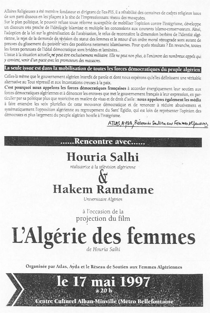 Tract appelant à une rencontre le 17 mai 1997 à l'occasion de la projection du film l'Algérie des femmes. (verso)