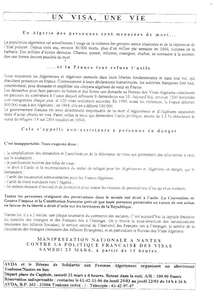 Tract Un visa, Une vie appelant à la manifestation de Nantes le 25 mars 1995.