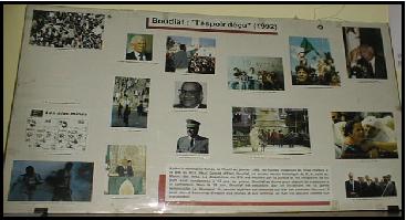 Cette exposition a été utilisée lors de certaines conférences ou des soirées organisées par Ayda et lors de la tenue de stands. Elle permet d'une manière originale d'aborder l'histoire de l'Algérie depuis ses origines. Voici pour montrer un exemple de réalisation d'un panneau la photo de la neuvième partie consacrée à Mohamed Boudiaf et son assassinat. (voir page précédente).